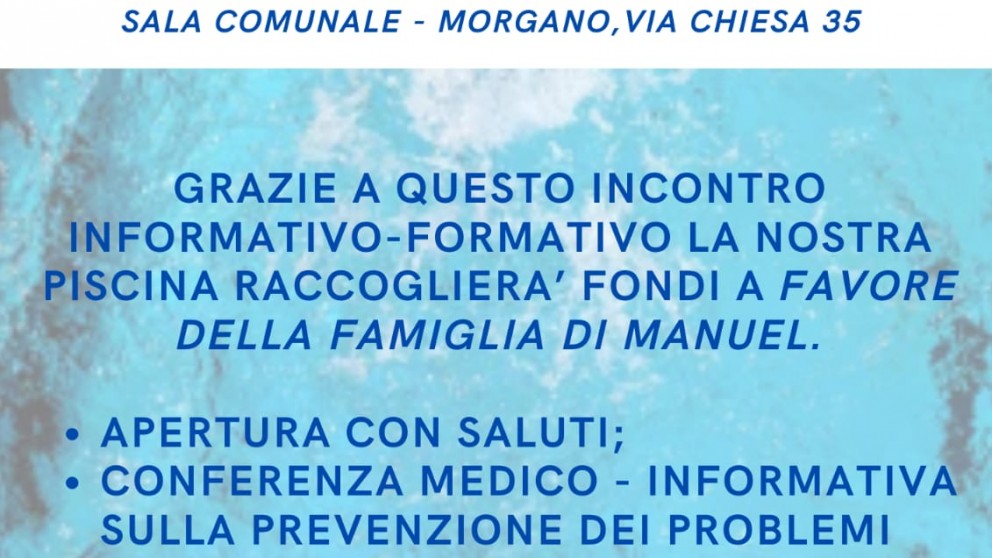 Insieme ad Iphon, con questo incontro informativo- formativo, la nostra piscina raccoglierà fondi a favore della famiglia di Manuel Favaro, nostro corsista affezionato scomparso in un tragico incidente il 18 ottobre di tre anni fa.